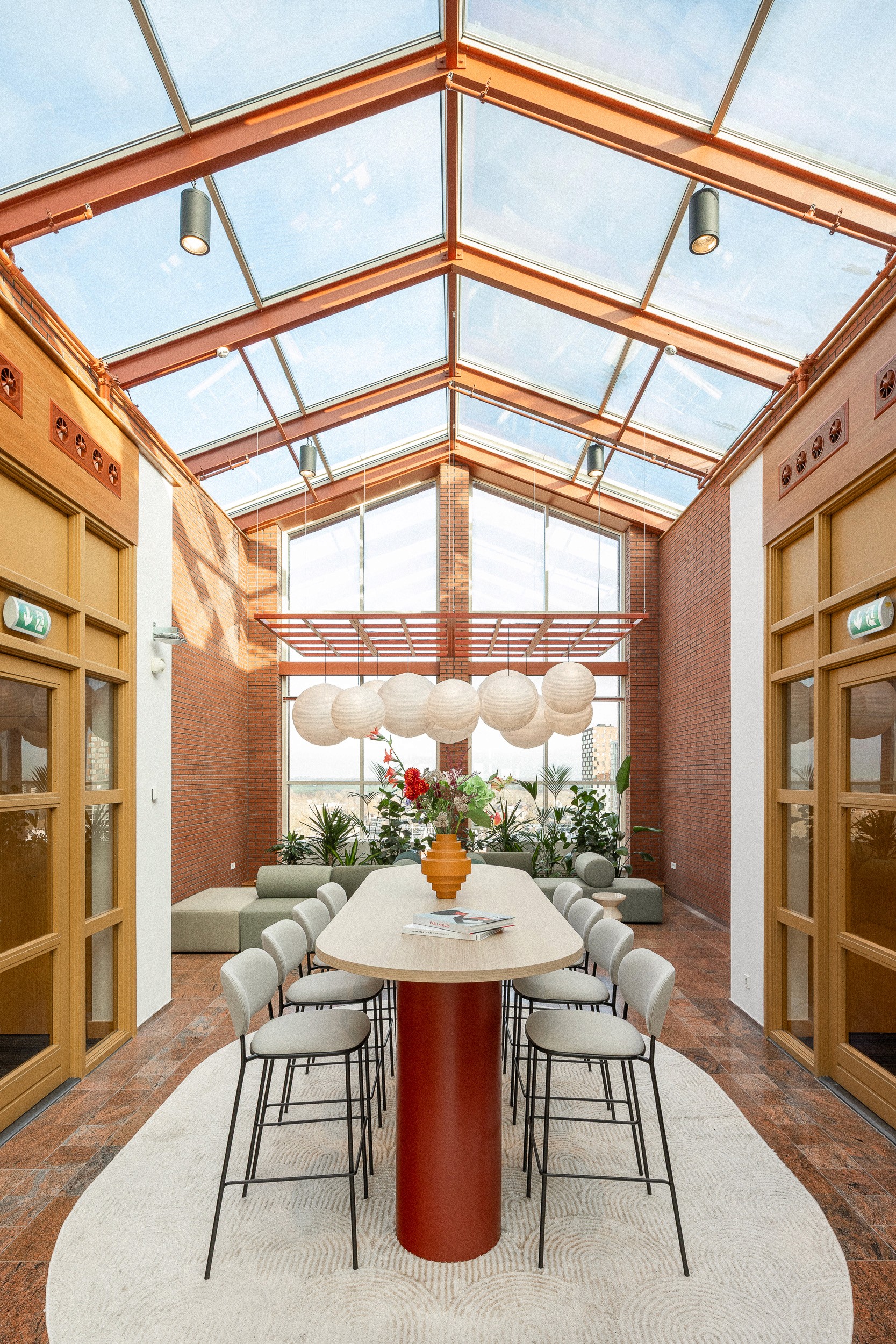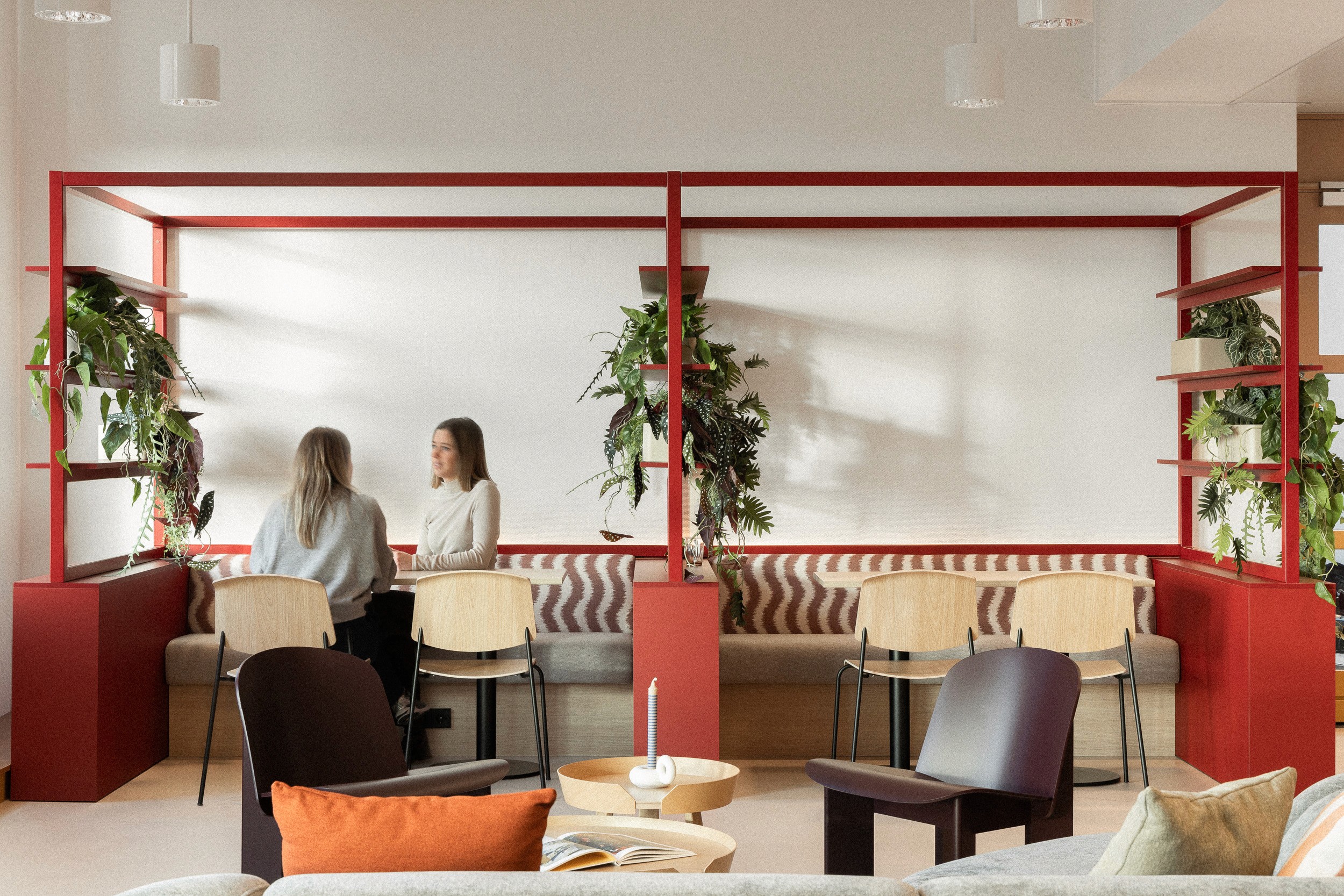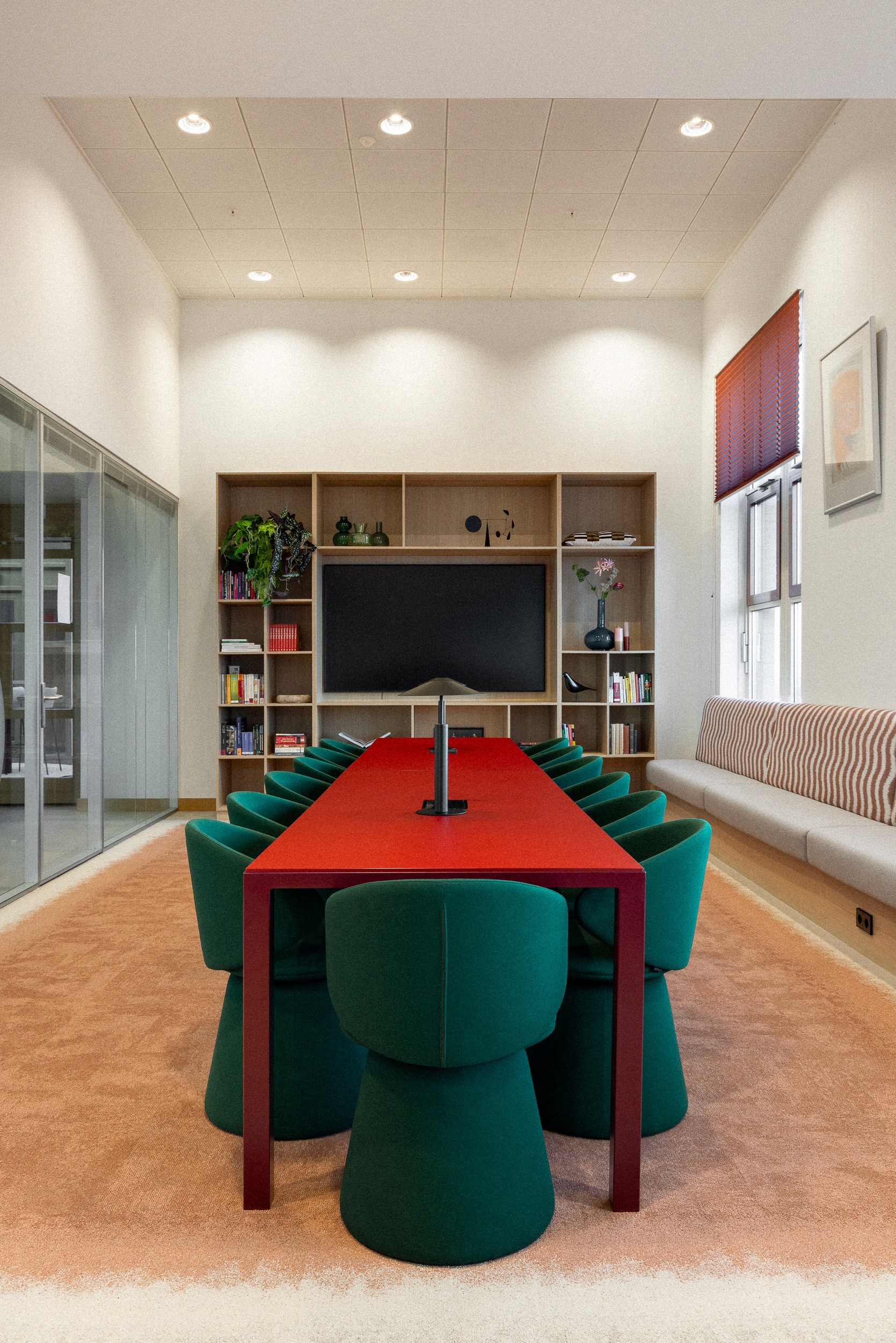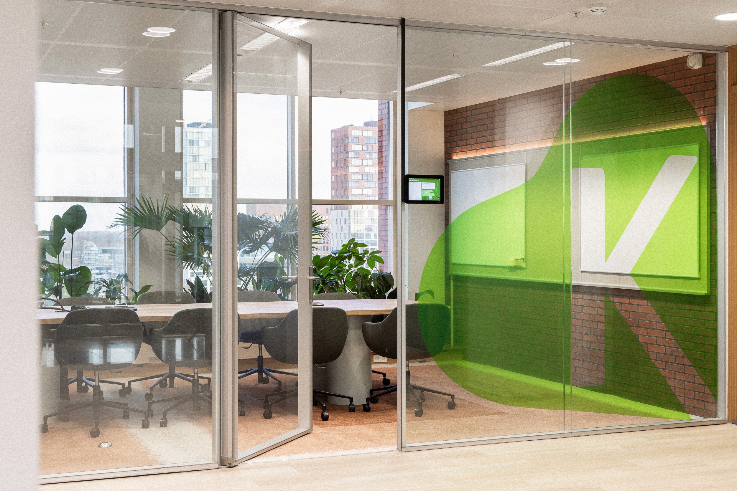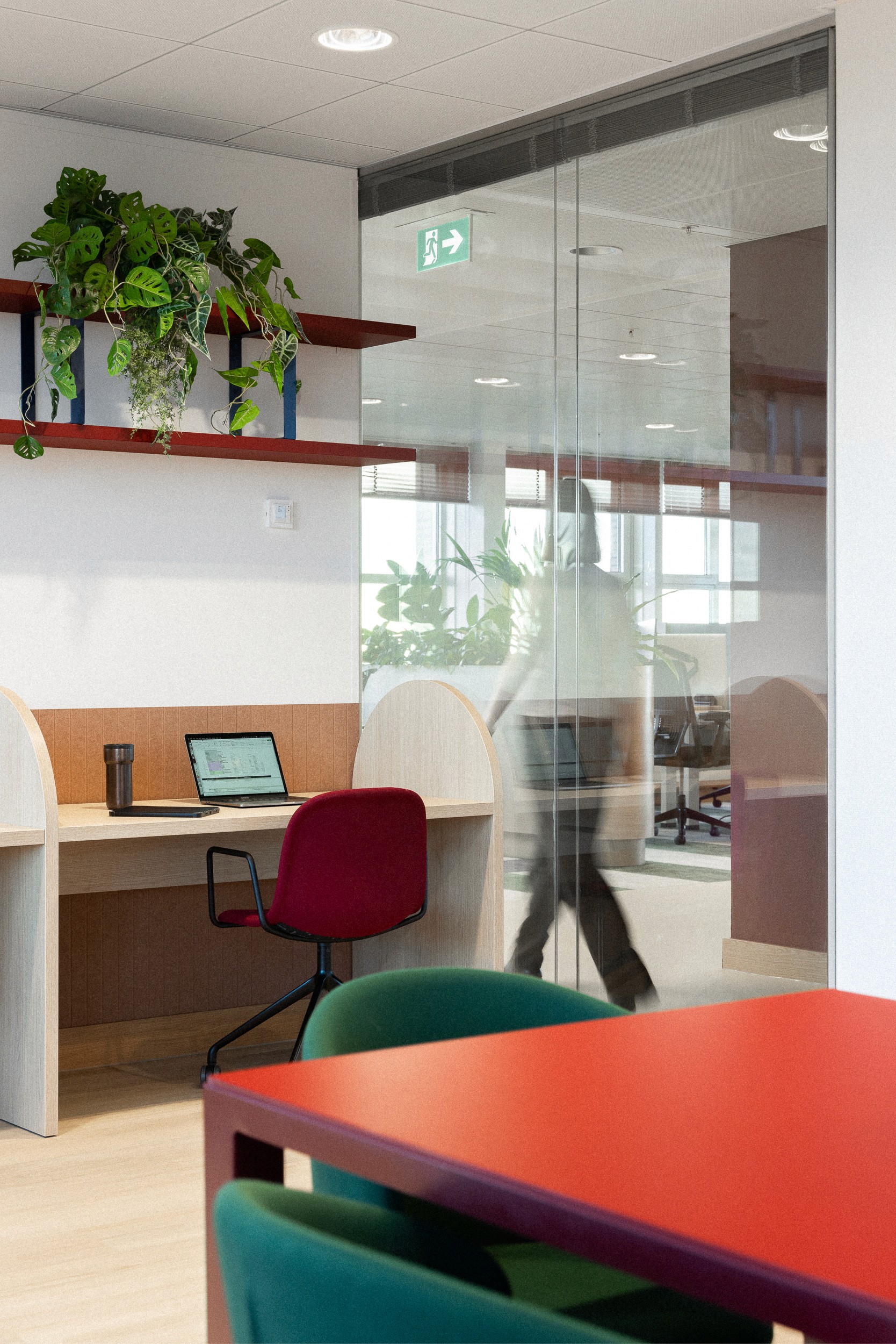 Per verdieping zijn herkenbare accenten aangebracht. Tegelijkertijd zijn grote delen herhaald, wat het maakproces eenvoudiger maakte. Elke verdieping heeft bovendien een eigen kleur als visuele oriëntatie. Veel vilt en stoffering verbetert de akoestiek. Glaswanden en roomdeviders houden de werkplek open, terwijl planten natuurlijke afscheidingen bieden. Alle werkplekken zijn uitgerust met elektrisch verstelbare zit-sta bureaus, een moderne standaard voor deze manier van werken.