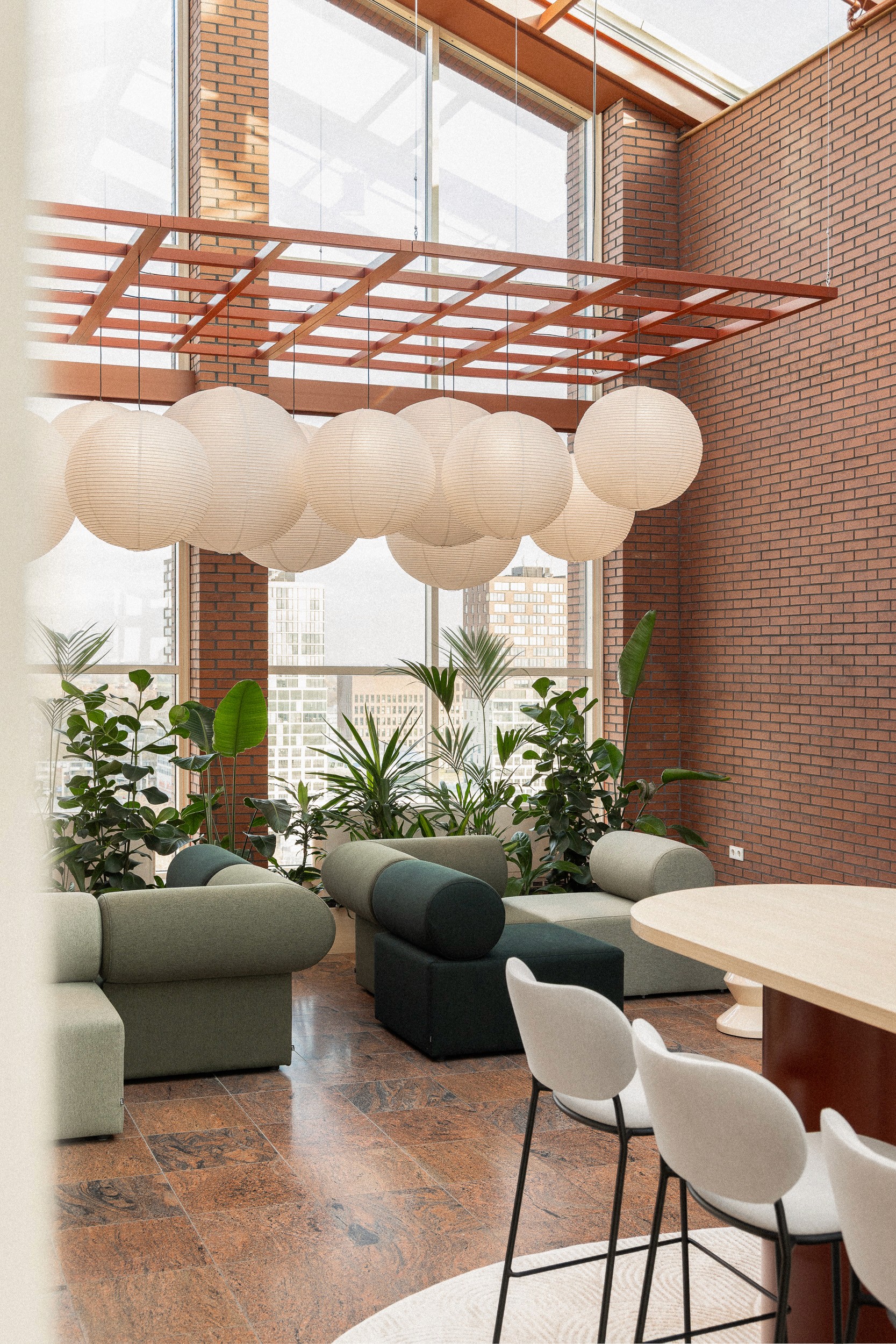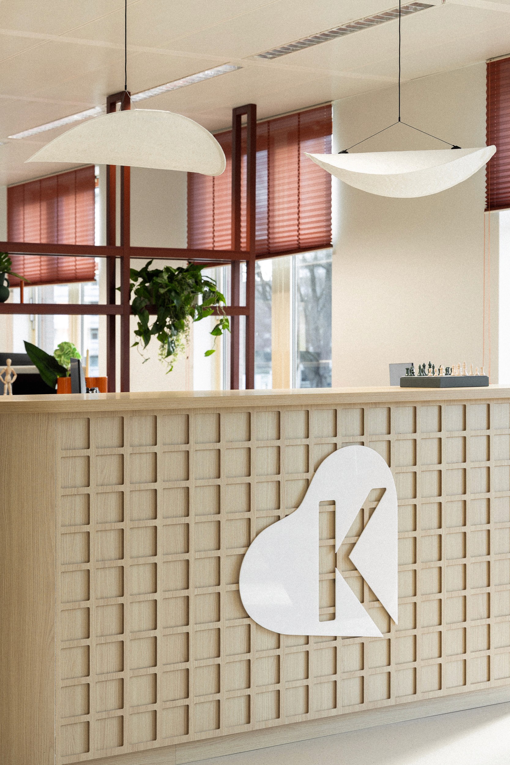 Bij Klaverblad stond gastvrijheid centraal in het ontwerp. De bestaande verdiepingen waren gesloten en traditioneel ingedeeld: veel dichte kantoren, weinig contact tussen mensen. Het nieuwe ontwerp brengt meer dynamiek en ontmoeting. Verschillende zones en vloeren worden gemixt en activity based ingericht. Zo ontstaat beweging op én tussen de verdiepingen. De centrale verkeersruimte is bewust ingezet als ontmoetingsplek waar collega’s elkaar kunnen tegenkomen, informatie delen of samen koffie drinken. Het interieur werkt met kleur, textuur, planten en zachte verlichting. Dat geeft een prettige werkomgeving die comfort, geborgenheid en een zakelijke huiselijkheid combineert.